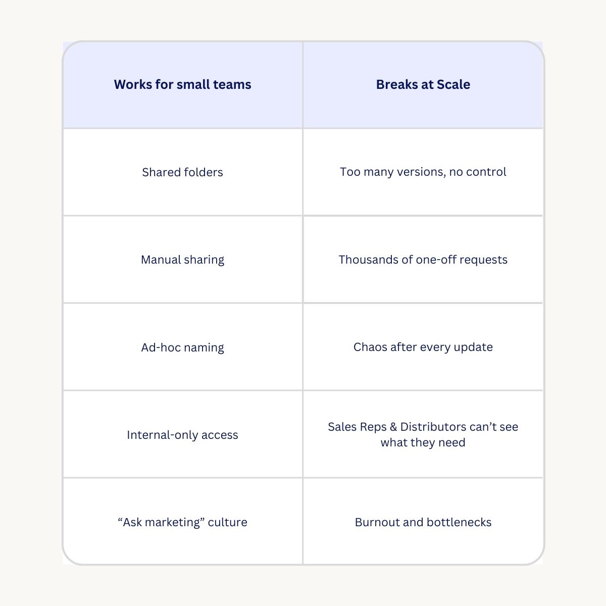 Files live on desktops, shared drives, or old servers. The marketing team has to dig through folders or email chains to find what’s current. Sales can’t find what they need, so they make their own materials. Distributors try to piece together assets from websites or outdated PDFs.